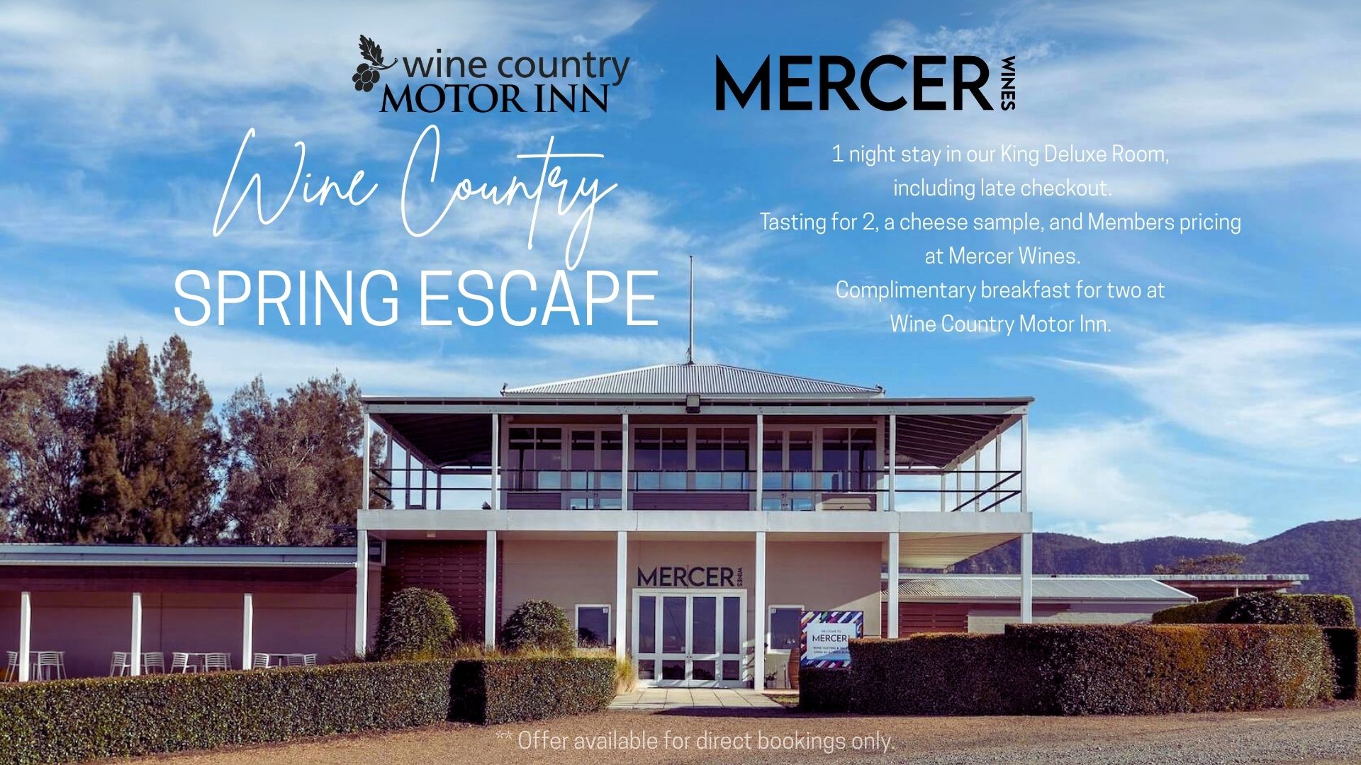 Treat yourself to a Wine Country Spring Escape at Wine Country Motor Inn. Your getaway includes a night in a spacious King Deluxe Room with the luxury of late checkout, a delicious complimentary breakfast for two, and a tasting experience at Mercer Wines complete with cheese pairings and exclusive members’ pricing. The perfect way to relax, sip, and savour the Hunter Valley — available only when you book direct.